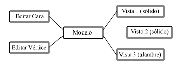 En este caso, la pieza central de la escena en tres dimensiones es el Modelo. El Modelo es una descripción matemática de los vértices y las caras que componen la escena. Los datos que describen cada vértice o cara pueden modificarse (quizás como resultado de una acción del usuario, o una distorsión de la escena, o un algoritmo de sombreado). Sin embargo, no tiene noción del punto de vista, método de presentación, perspectiva o fuente de luz. El Modelo es una representación pura de los elementos que componen la escena.