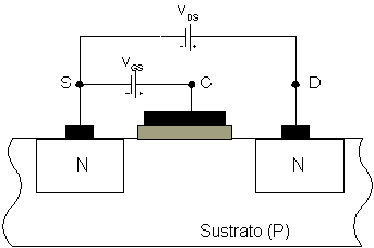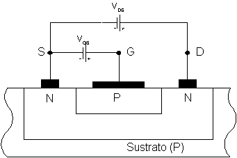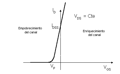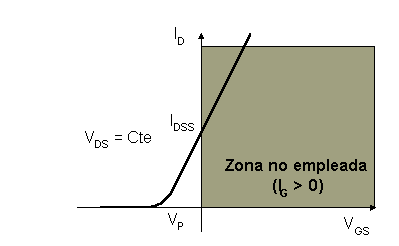 Por el terminal de puerta (G) no circula más que la corriente de fuga del diodo GS, que en una primera aproximación podemos considerar despreciable. La corriente ID presenta una doble dependencia: