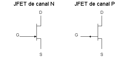 Un JFET de canal N se fabrica difundiendo una región de tipo P en un canal de tipo N, tal y como se muestra en la Figura 1. A ambos lados del canal se conectan los terminales de fuente (S, Source) y drenaje (D, Drain). El tercer terminal se denomina puerta (G, Gate).