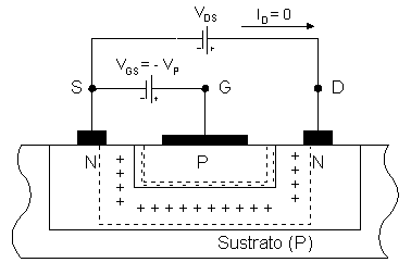 Si el valor de VGS se hace lo suficientemente negativo, la región de agotamiento se extenderá completamente a través del canal, con lo que la resistencia del mismo se hará infinita y se impedirá el paso de ID (Figura 3). El potencial al que sucede este fenómeno se denomina potencial de bloqueo (Pinch Voltage, VP).