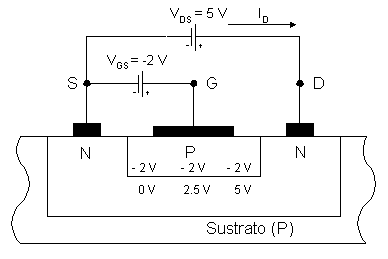 Cuando se aplica un voltaje VDS al canal de 5 voltios, por ejemplo, este se distribuye a lo largo del canal, es decir, en las proximidades del terminal D la tensión será de 5 V, pero a medio camino la corriente circulante habrá reducido su potencial a la mitad (2,5 V), y en el terminal S el potencial será nulo. Por otra parte, si VGS es negativa (- 2 V, por ejemplo), la tensión se distribuirá uniformemente a lo largo de la zona P, al no existir ninguna corriente (Figura 5). (NOTA: se desprecia la caída de tensión en las zonas situadas por debajo de los contactos).