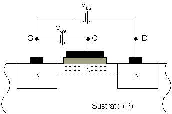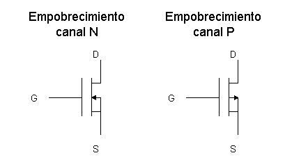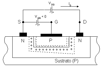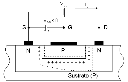 En este caso el canal ya está creado. Por lo tanto, si con VGS = 0 aplicamos una tensión VDS aparecerá una corriente de drenaje ID. Para que el transistor pase al estado de corte será necesario aplicar una tensión VGS menor que cero, que expulse a los electrones del canal.