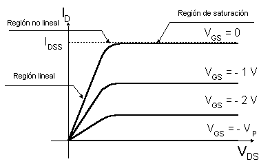 En la característica VDS - ID del transistor NJFET se observa la diferencia entre las regiones lineal y de saturación (Figura 9). En la región lineal, para una determinada VGS, la corriente crece proporcionalmente a la tensión VDS. Sin embargo, este crecimiento se atenúa hasta llegar a ser nulo: se alcanza el valor de saturación, en donde ID sólo depende de VGS.