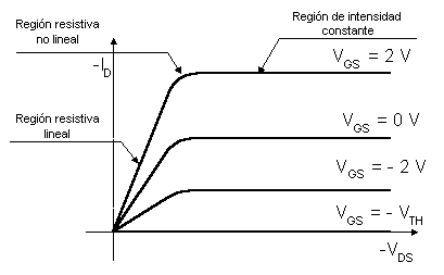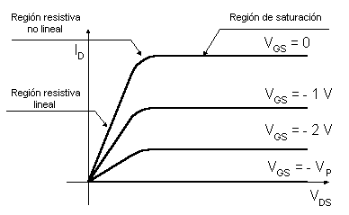 2. Región lineal: es la región en que se produce un incremento de la intensidad ID al aumentar VDS. Este incremento es lineal para bajos valores de VDS aunque la linealidad se pierde cuando VDS se acerca a -VP. Para trabajar en la región lineal se deben dar dos condiciones: