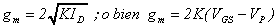 Para el caso en el que el transistor soporte señales alternas de pequeña amplitud y baja frecuencia sobre un punto de polarización en región de saturación, puede demostrarse de forma análoga a como se ha realizado para el transistor JFET que la transconductancia gm se calcula a través de la siguiente expresión