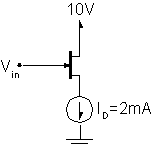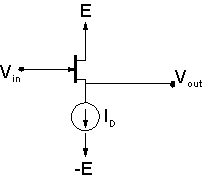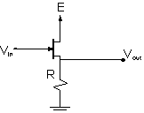 • La tensión de entrada Vin es una tensión que varía muy lentamente con el tiempo de manera que, se puede resolver el circuito mediante un análisis en continua. Si E=10V e ID=1mA, calcular la relación entre Vout y Vin. ¿Qué intensidad ID se debe establecer en la fuente si se quiere que Vout=Vin? Datos del transistor: IDSS=3mA VP=-5V