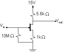 • En el circuito de la figura, calcular la resistencia de entrada RIN y la tensión de salida VOUT. Si se conecta una resistencia de 4.7k a la salida del circuito, calcular la tensión de salida. Datos del transistor: IDSS=8mA, VP=-10V