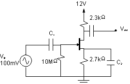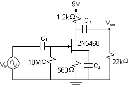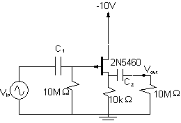 • En el circuito de la figura se ha utilizado un transistor 2N5460. Calcular la ganancia de tensión del circuito. Nota: Utilizar para ello los valores medios de los parámetros del transistor.