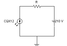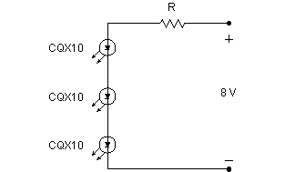 E=50mW/mA y Vf=1.3V está alimentado por una fuente de tensión que