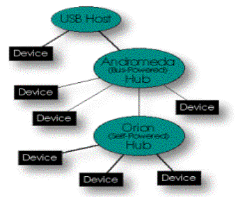 El USB organiza el bus en una estructura de árbol descendente, con múltiples dispositivos conectados a un mismo bus, en la que unos elementos especiales, llamados hubs(periférico que será descrito específicamente mas adelante), enrutan las señales en su camino desde un dispositivo al host o viceversa. Primero está el controlador del bus, Este es el interfaz entre el bus USB y el bus del ordenador. De él cuelgan los dispositivos USB. Los hubs, como son un dispositivo USB más, también cuentan. A un hub se puede conectar uno o más dispositivos, que a su vez pueden ser otros hubs, asi tenemos varios dispositivos conectados a un sólo controlador; como máximo alrededor de 126.