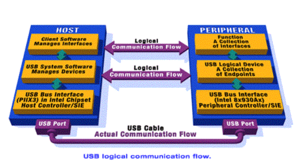Entre las empresas desarrolladoras de USB, ya antes mencionadas, existen más de 250 otras empresas menores que fabrican semiconductores, computadoras, periféricos y software, todas trabajando por  poner en el mercado la mayor cantidad posible de elementos USB. En todos los casos, la estructura esquemática de los buses es la que se muestra en el esquema siguiente.