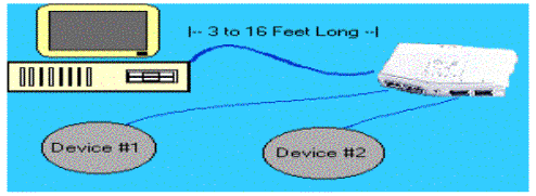 Se puede conectar hasta un total de 127 dispositivos en cadena o utilizando HUBs USB (concentradores de puertos USB), y cada dispositivo puede tener un cable de hasta 5 metros de longitud, frente a 1 metro para el puerto serie y 4 metros para el puerto paralelo. Además, conectándolos en cadena, el último dispositivo puede estar a 635 metros del ordenador.
